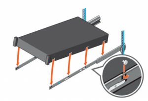 - Pullthe blue side release lock tabs forward or backward on both rails and slide the system into the rack until the system is in the rack.